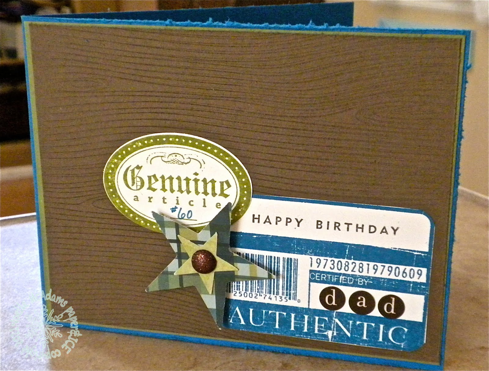 So, as with the other day, TIME is of the essence for me right now! So, I wanted to make a quick, CAS, masculine card that didn't take too much time & in colors I knew he would like. I pulled out this old SU! stamp set, as well as the Woodgrain background set and a birthday set for the sentiment. I stamped the stamps in Old Olive and Pacific Point, then I added the birthday sentiment in Early Espresso. I wrote in the #60, on the "genuine article" image. I added some stickers to spell out "Dad" and the final touch was some punched, layered stars in masculine prints and to distress the card edges.