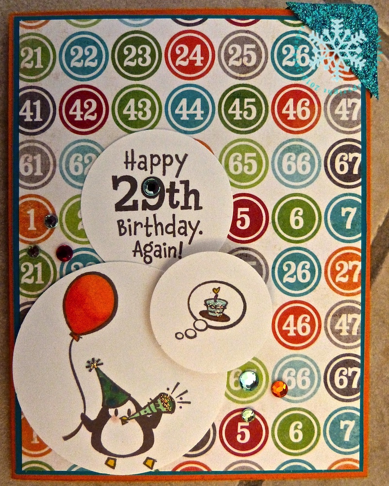 I used my fave ever birthday sentiment, cute little penguin with his balloon, and a mini stamp from the set I hadn't ever used before. it's like a thought bubble with a cake in it. I thought it lent itself well to this sketch.